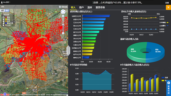 實時集中監控平臺以簡潔、美觀的圖表頁面,集中展現企業各環節經營數據。武漢移動經過多年信息化的建設,已形成區域化的業務管理體系,并積累了大量的業務數據。為清晰呈現各項指標在全市范圍內不同區域的整體情況,億信BI通過在GIS地圖上對各區域模塊進行顏色渲染,清晰展示企業業務區域的分布情況(如下圖左側所示),同時通過多TAB頁的展示方式(如下圖右側所示),以專題化(包括收入,用戶發展、4G發展等專題)的頁面,分析了各主題中不同項經營指標的排名,占比,趨勢以及對比情況,從而使決策者可快速定位自己所關心的重點數據。