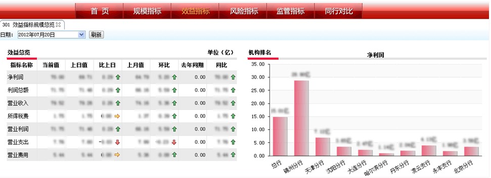 領導駕駛艙是對于管理者開放的模塊,包括管理者日常工作中最關注的指標,并且通過直觀的圖形的方式展示,便于管理者快速了解銀行的經營狀況以及進行風險的預警。