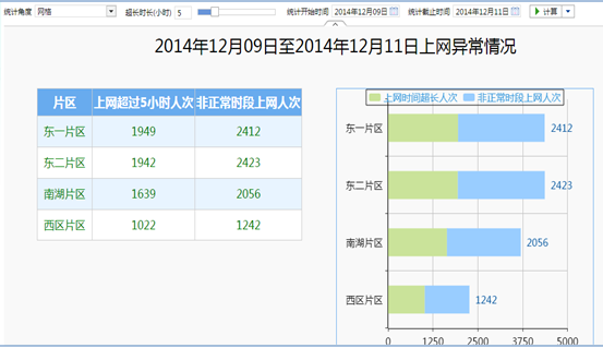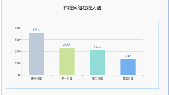 該部分只有柱狀圖展現(xiàn)在線人數(shù),柱子滿足維度下鉆至樓棟。該部分?jǐn)?shù)據(jù)直接來自中間視圖表,數(shù)據(jù)每隔一分鐘更新一次,用計劃任調(diào)用后臺etl過程更新數(shù)據(jù)。報表也每隔一分鐘重新自動計算一次。從而達(dá)到網(wǎng)絡(luò)在線實時情況展現(xiàn)這一目標(biāo)。