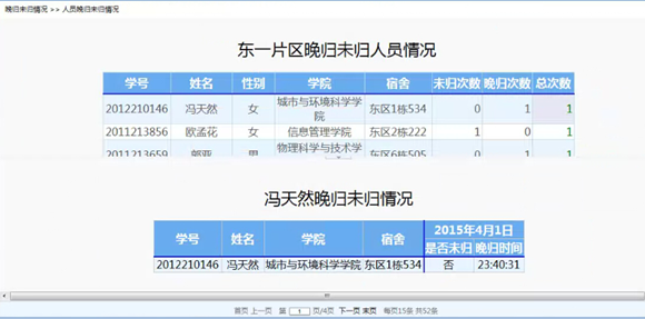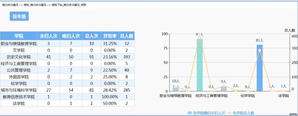 通過時間參數(shù)段內(nèi)的未歸人次、晚歸人次、男女異常率指標(biāo)展示。
