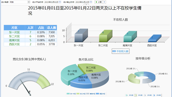 系統(tǒng)提供學(xué)生安全監(jiān)測與預(yù)警,利用學(xué)生的日常管理數(shù)據(jù),通過對信息的分析和比對,使學(xué)校能隨時掌握學(xué)生信息,及時發(fā)現(xiàn)安全隱患,保障學(xué)生安全。