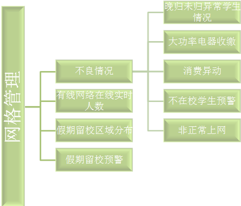 網(wǎng)格部分旨在進(jìn)行網(wǎng)格化數(shù)據(jù)分析與展現(xiàn),涉及內(nèi)容包括宿舍管理,學(xué)生學(xué)業(yè)、生活、消費健康安全等各項內(nèi)容。何謂網(wǎng)格化管理,即仿效社區(qū)的網(wǎng)格化管理,按照一定的規(guī)則劃分成網(wǎng)格單元,每個網(wǎng)格單元分別管理。目標(biāo)更加明確,管理更加細(xì)致。
