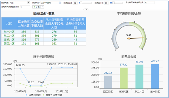 通過學(xué)生在食堂刷卡消費的明細(xì)數(shù)據(jù)進(jìn)行整體分析,統(tǒng)計異動人次,再則鉆取到其消費明細(xì)。參數(shù)多樣,可滿足不同要求標(biāo)準(zhǔn)的數(shù)據(jù)展現(xiàn)。