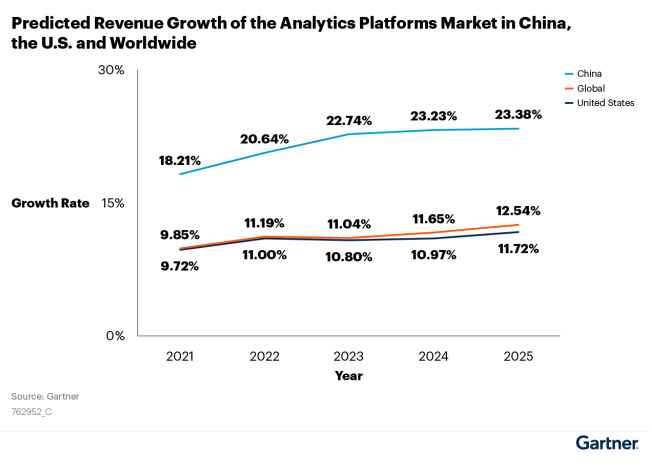 報告指出:中國分析平臺市場規(guī)模將持續(xù)增長。在數(shù)字化轉(zhuǎn)型趨勢、自助服務(wù)、增強(qiáng)分析以及商業(yè)智能解決方案的推動下,到2023年,整體分析采用率將從35%增加到50%。預(yù)計到2025年,中國分析平臺市場規(guī)模將達(dá)到16億美元,市場增長率將由18.21%提升到23.38%,是全球(12.54%)和美國(11.72%)市場預(yù)期增長的兩倍左右。