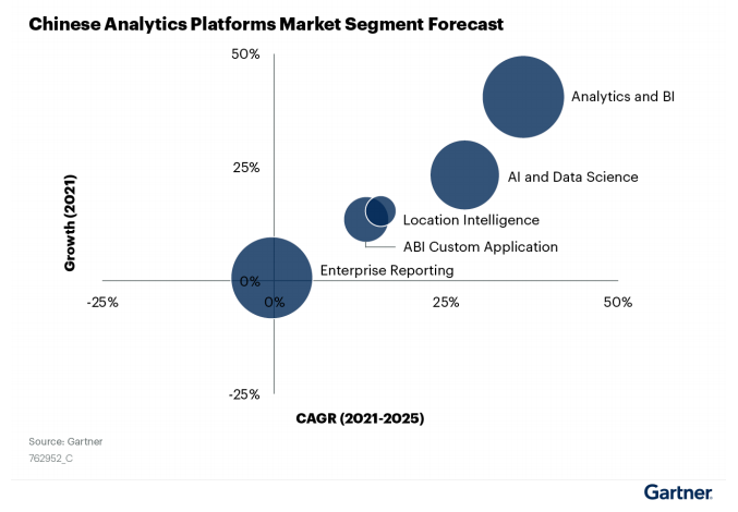在《指南》中,Gartner對數(shù)據(jù)分析平臺的能力做了進(jìn)一步的定義,包括了:企業(yè)報告平臺、ABI平臺、AI和數(shù)據(jù)科學(xué)平臺、ABI定制化應(yīng)用和位置智能平臺等方向。而在這些細(xì)分市場中,增長最快的領(lǐng)域是ABI平臺、AI和數(shù)據(jù)科學(xué)平臺,預(yù)計復(fù)合年增長率分別為36.23%和27.72%。