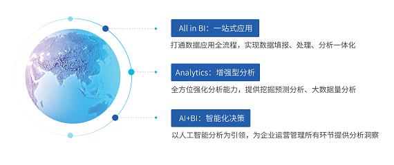 AII in BI:一站式應(yīng)用型BI。產(chǎn)品功能全面,打通數(shù)據(jù)應(yīng)用全流程,實現(xiàn)數(shù)據(jù)填報、處理、分析一體化。一個產(chǎn)品平臺即可為政企用戶提供從數(shù)據(jù)準(zhǔn)備,ETL數(shù)據(jù)處理、數(shù)據(jù)建模、數(shù)據(jù)可視化、數(shù)據(jù)分析、數(shù)據(jù)填報、移動應(yīng)用等一系列功能。