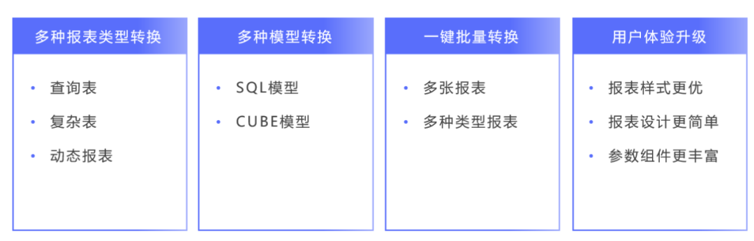 億信ABI覆蓋Cognos轉換各種場景,包括各類報表(查詢表、復雜表、動態報表等)、模型(SQL模型、CUBE模型、模型表等)的轉換都能完美適配,提供批量轉換功能,大大提高轉換效率。