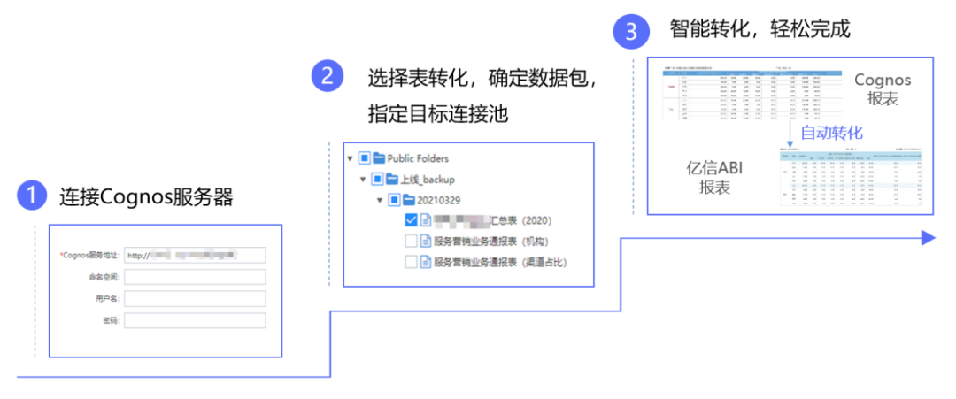 為解決重復做表與建模問題,通過億信華辰獨家技術實現Cognos報表的批量轉換、自動轉換,只需三步完成Cognos報表到億信ABI報表的轉換,全程只需幾分鐘。