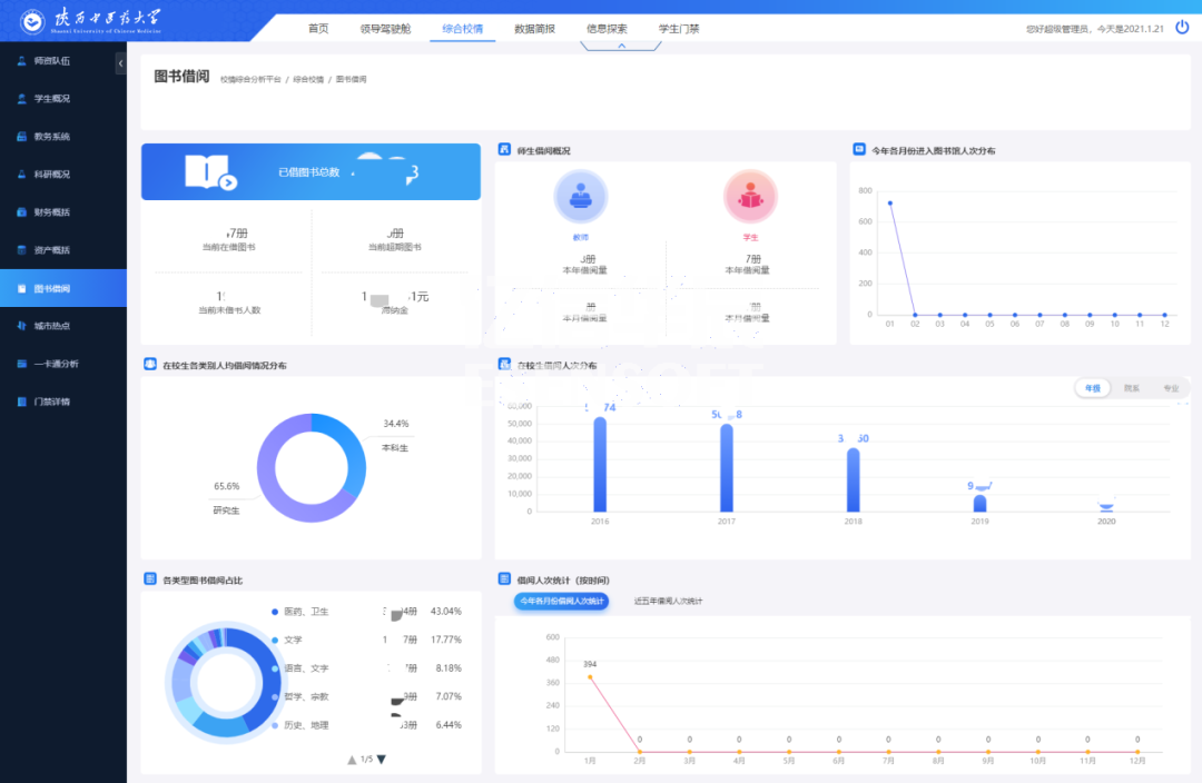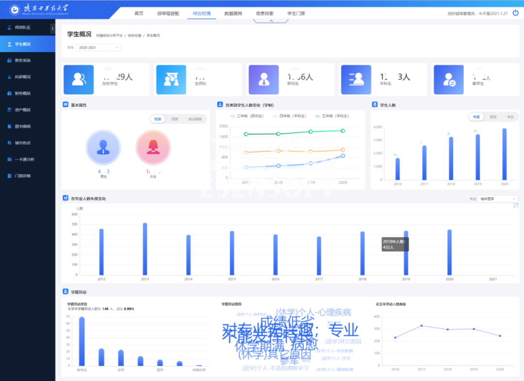 陜西中醫(yī)藥大學(xué)利用億信ABI建設(shè)了統(tǒng)一的校情綜合分析平臺(tái),涉及內(nèi)容包括首頁(yè)、領(lǐng)導(dǎo)駕駛艙、綜合校情、數(shù)據(jù)簡(jiǎn)報(bào)、信息探索和學(xué)生門禁等各項(xiàng)內(nèi)容。通過(guò)數(shù)據(jù)化運(yùn)營(yíng)改進(jìn)數(shù)據(jù)收集和管理方式,用數(shù)據(jù)驅(qū)動(dòng)業(yè)務(wù),對(duì)業(yè)務(wù)數(shù)據(jù)進(jìn)行可視化分析,以提升學(xué)校管理水平和服務(wù)能力。
