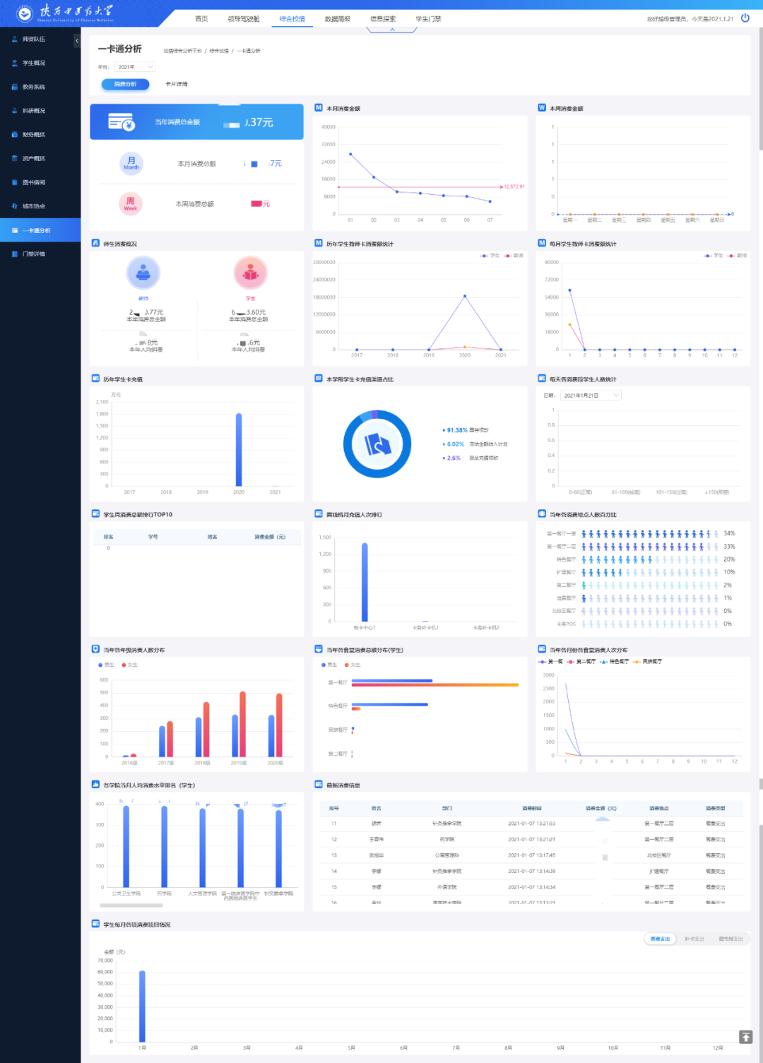 一卡通分析頁(yè)面通過(guò)對(duì)全校師生消費(fèi)和卡片進(jìn)行分析,可以讓學(xué)校管理者對(duì)在校師生的消費(fèi)情況和規(guī)律有一個(gè)量化的認(rèn)識(shí),從而能夠合理地分配資源,降低管理成本,這對(duì)校園的規(guī)劃建設(shè)和學(xué)校學(xué)生管理工作都具有重要的作用。如下圖: