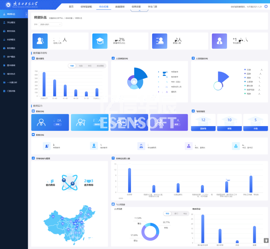 豐富的校情可視化數(shù)據(jù)看板 在綜合校情查詢與主題分析角度,對(duì)教務(wù)教學(xué)、科研、資產(chǎn)、財(cái)務(wù)、人事與學(xué)生管理、一卡通等業(yè)務(wù),進(jìn)行結(jié)構(gòu)、趨勢(shì)、分布等綜合分析,讓各級(jí)領(lǐng)導(dǎo)一屏在手,掌握全局,多種指標(biāo)實(shí)時(shí)隨地呈現(xiàn),助力科學(xué)決策。 師資隊(duì)伍 高校師資隊(duì)伍建設(shè)的優(yōu)劣決定了高校人才培養(yǎng)質(zhì)量的高低。如何在大數(shù)據(jù)時(shí)代科學(xué)利用源于高校各個(gè)層面的海量數(shù)據(jù),并使之成為高校師資隊(duì)伍建設(shè)的參考與方向,是眾多高校需要解決的問(wèn)題。師資隊(duì)伍頁(yè)面通過(guò)展現(xiàn)教職工主要的屬性指標(biāo),分析了目前高校師資隊(duì)伍建設(shè)中所存在的問(wèn)題,對(duì)加強(qiáng)高校師資隊(duì)伍建設(shè)起到指導(dǎo)作用。如下圖: