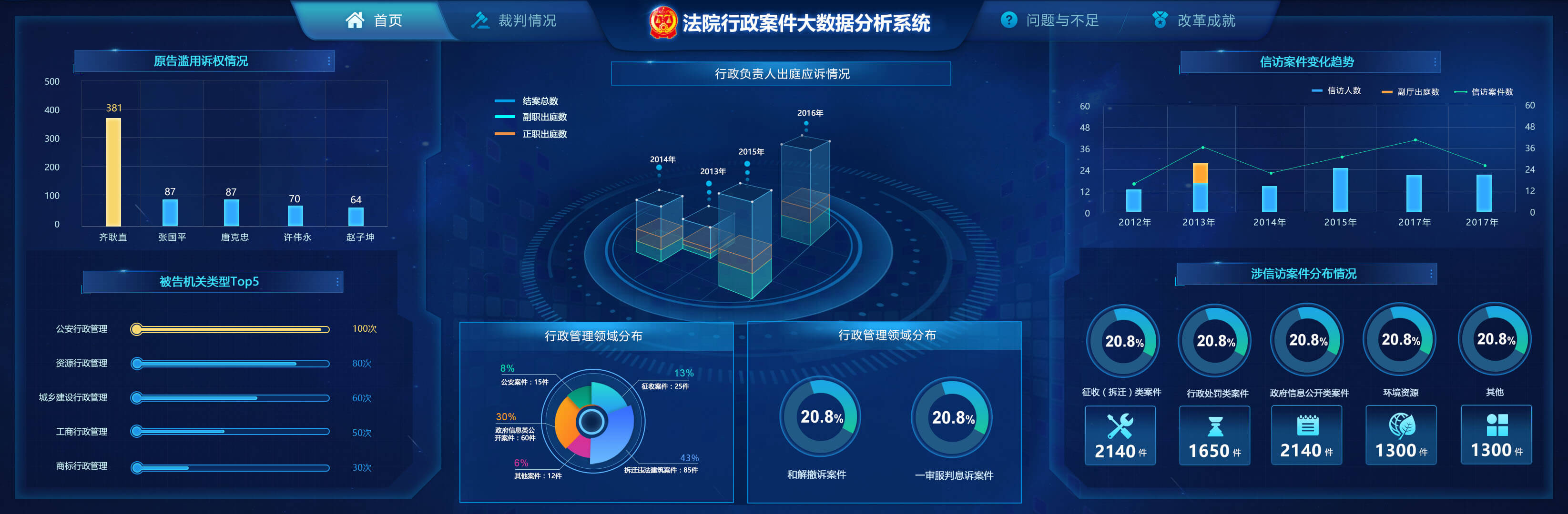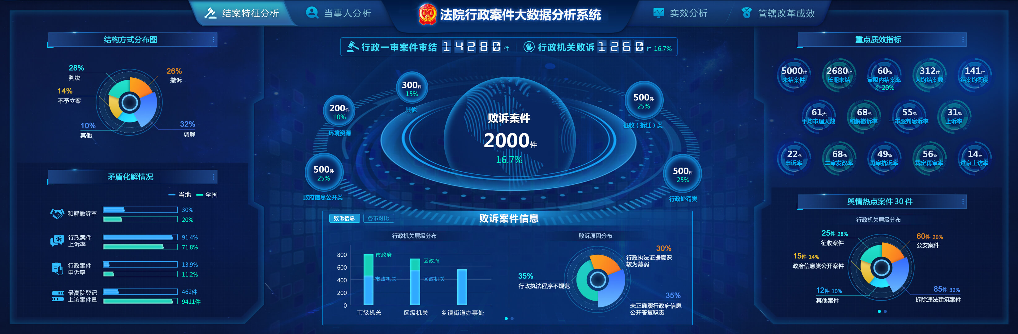 法院行政案件大數據分析系統包含了結案特征分析、當事人分析、實效分析和管轄改革成效。通過收案/結案的數量和增幅,分別用時間、領域、地區等維度分析案件變化趨勢,從結構方式、矛盾化解情況、重點質效指標、輿情熱點案件、敗訴案件和敗訴案件信息來分析結案特征,用信訪案件變化趨勢和分布情況針對機關濫用職權情況來特別分析。不同分析角度分析不同數據,實現案件大數據全方位解讀。
